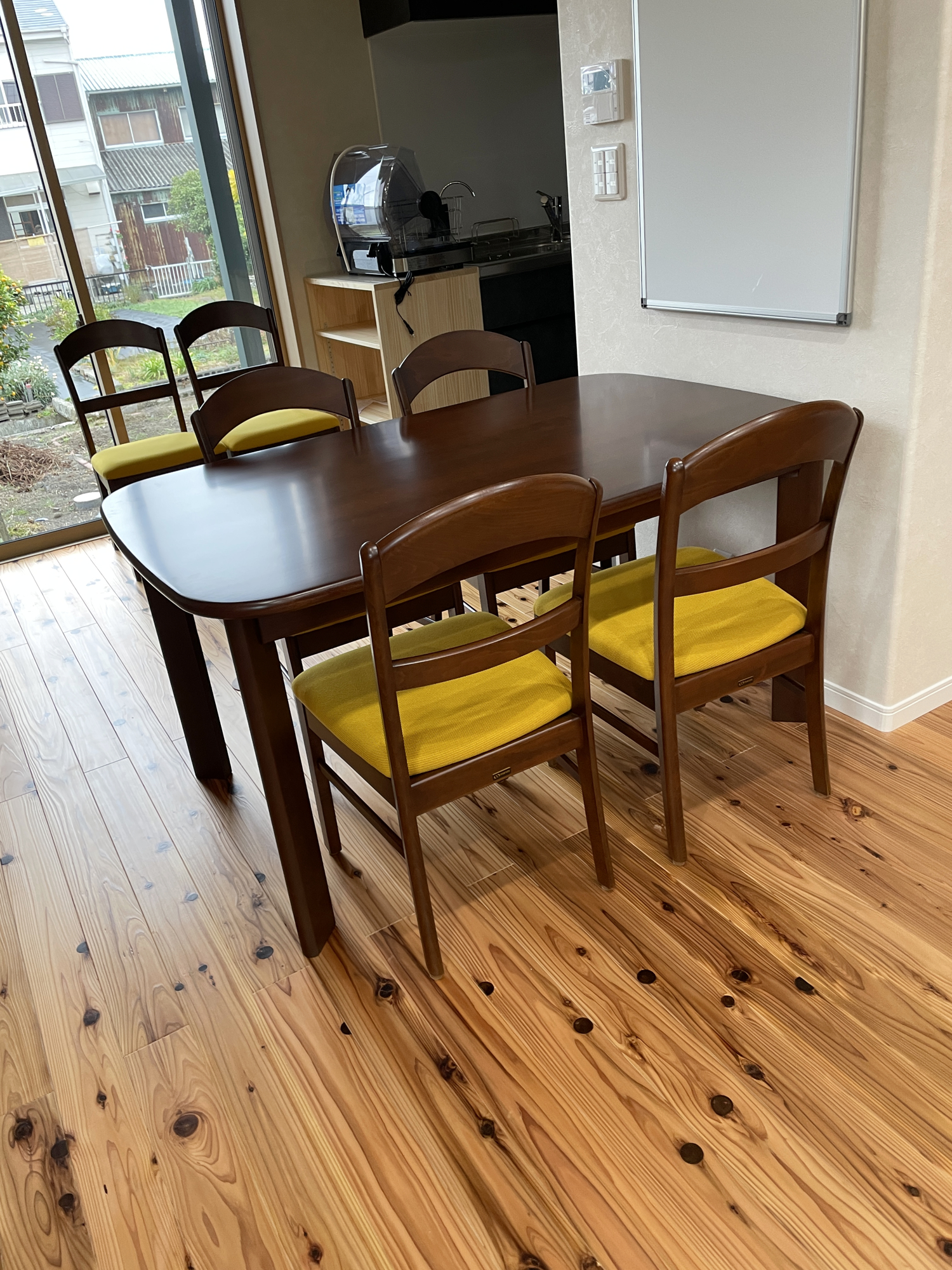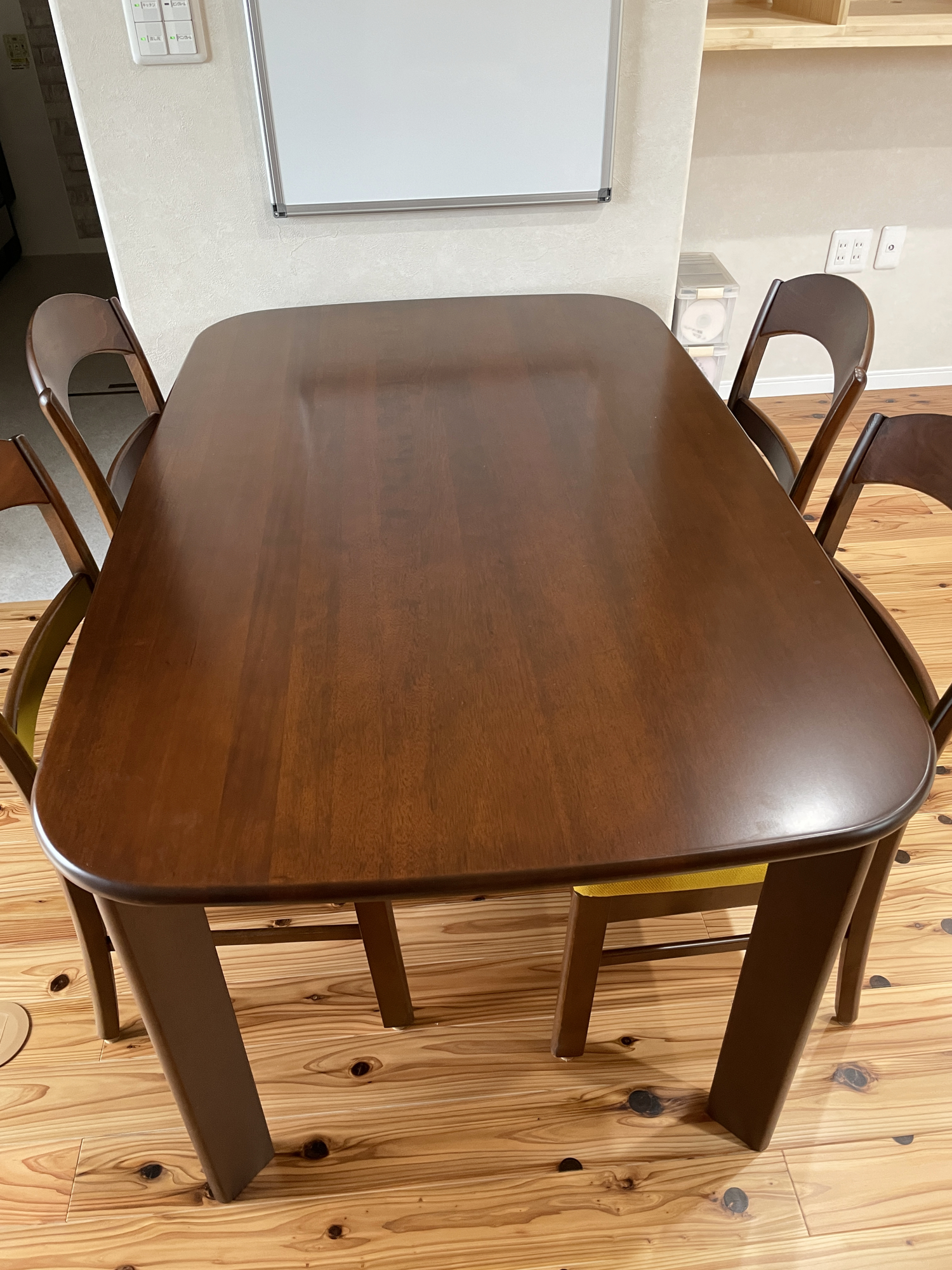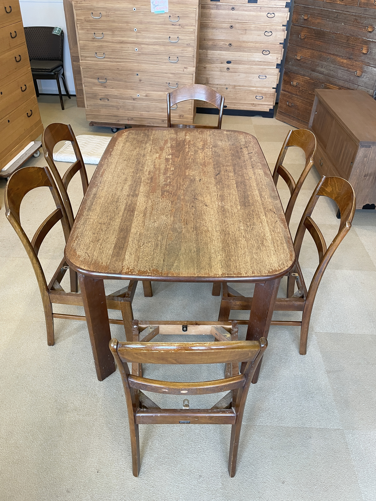 こちらが30年以上前、奥さまが嫁入り道具として持ってこられたダイニングテーブルセット。ご家族の食卓を長年支えてきた、国産のしっかりとしたつくりのダイニングセットです。