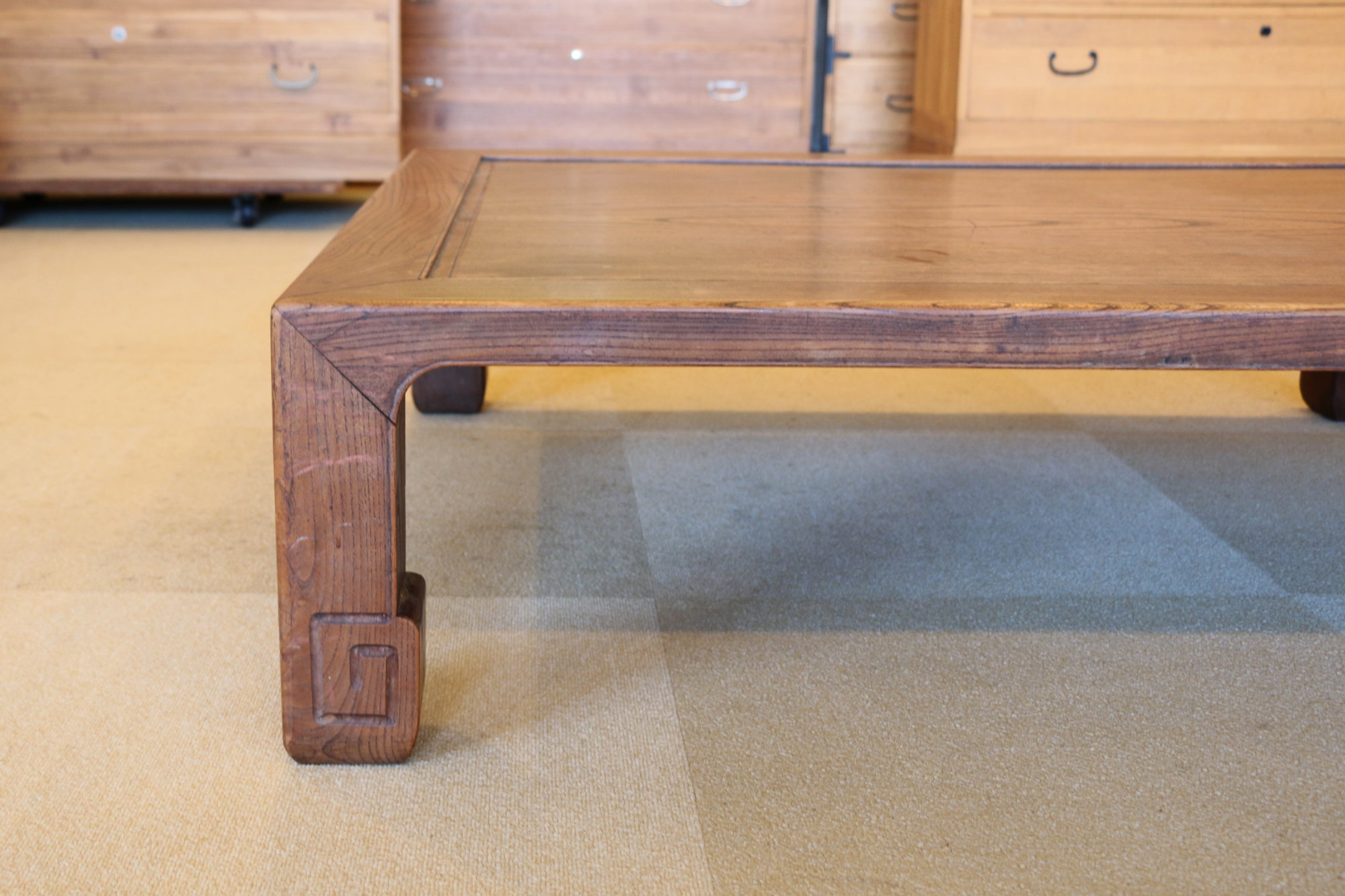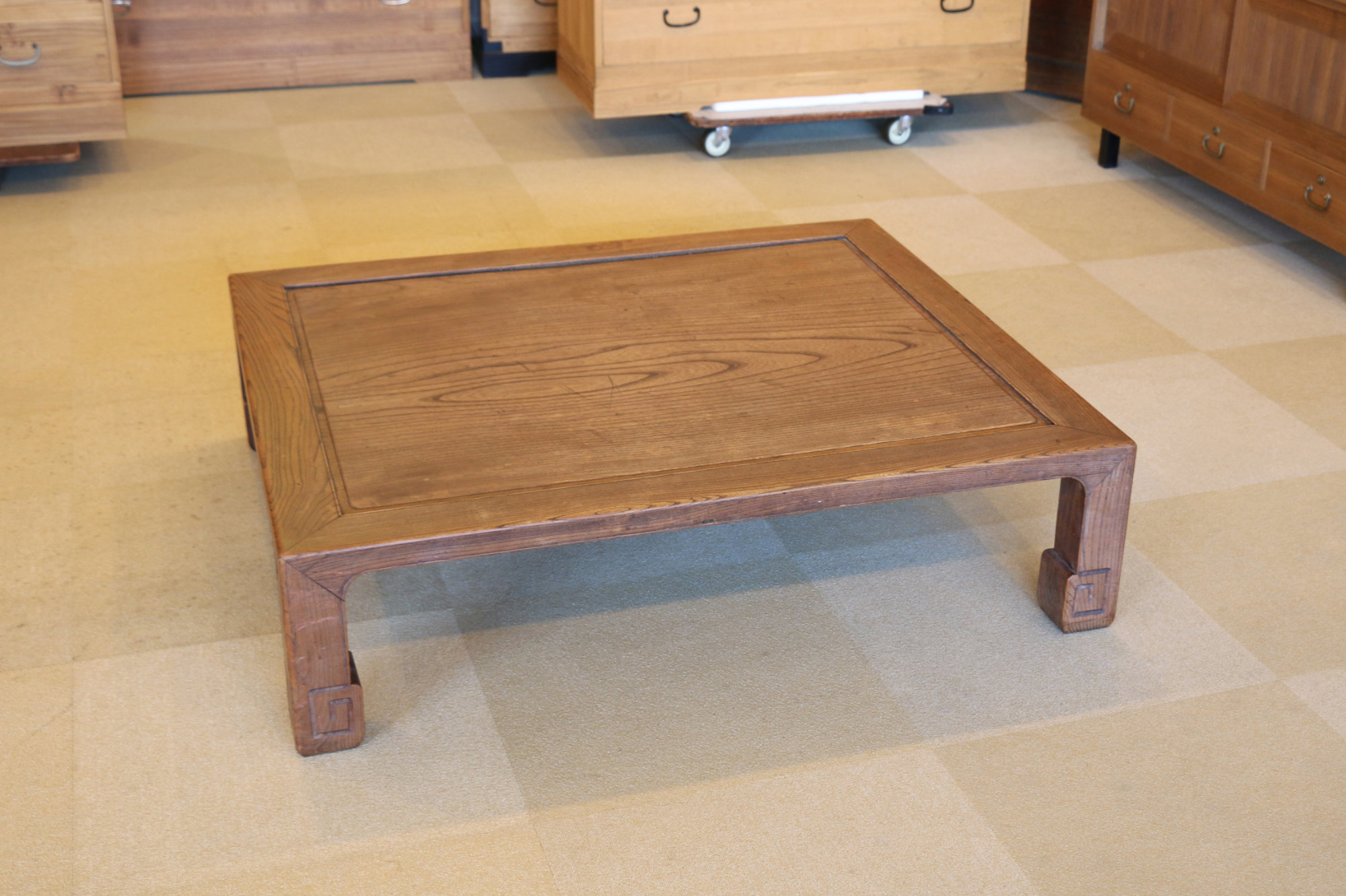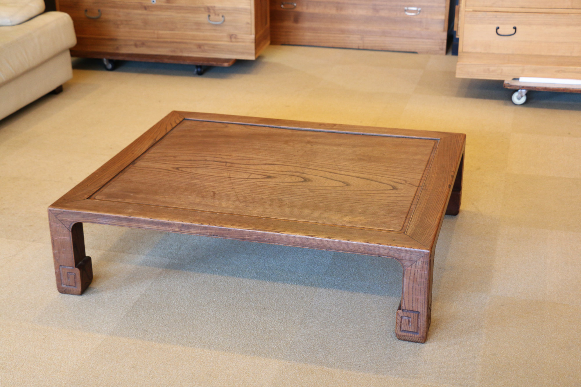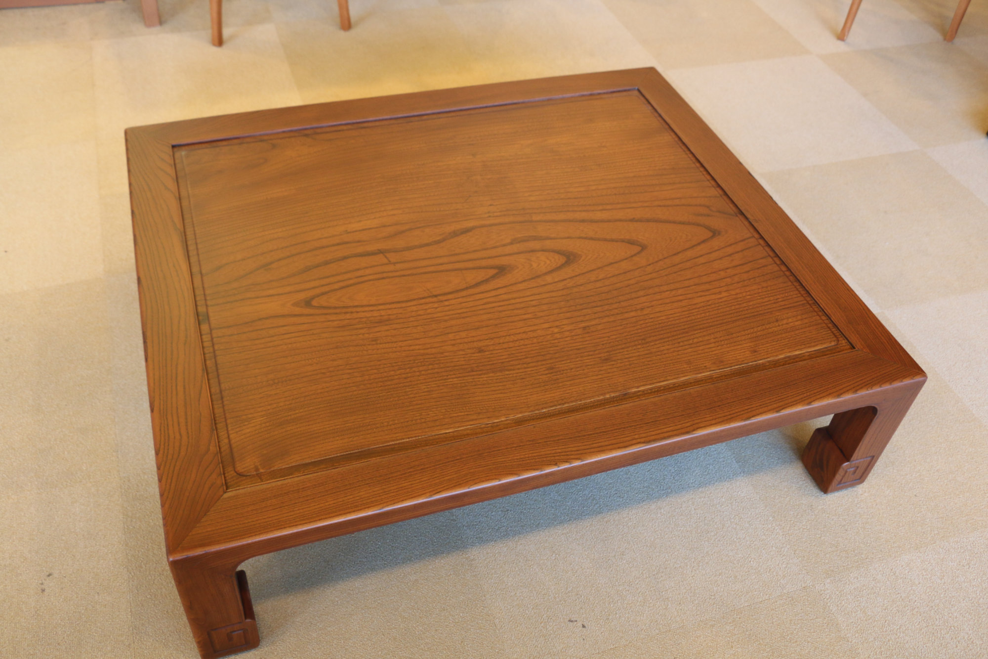 一点目は、明治期につくられたと見られる、けやきの座卓です。正方形の一枚板という特別な形で、現在では同じものをつくることは難しいほど、立派な木材と技が注がれています。