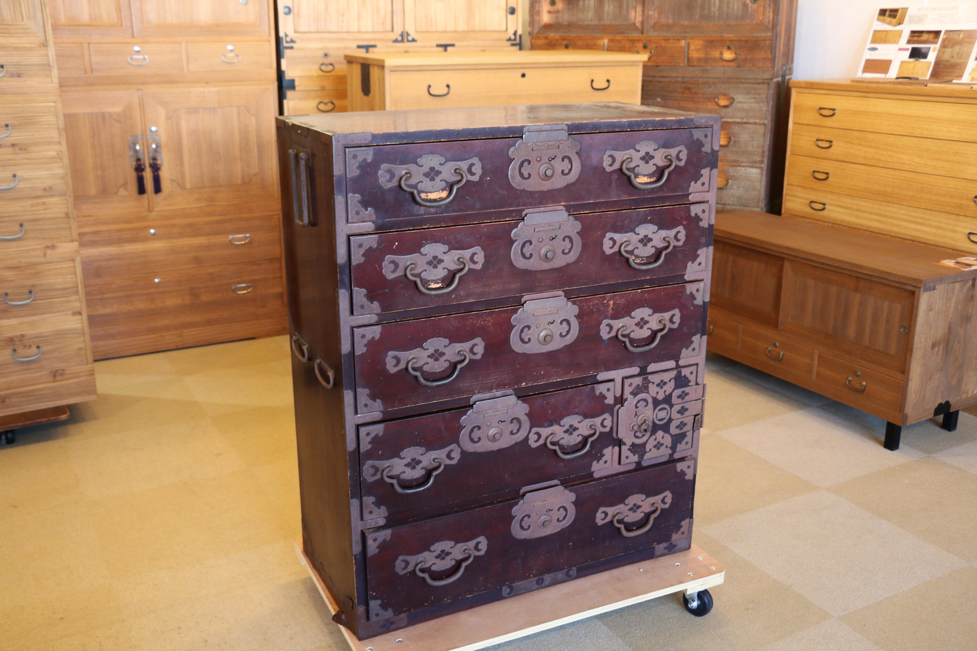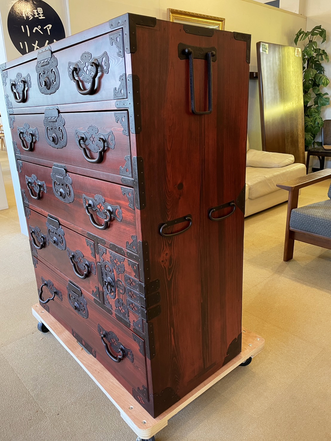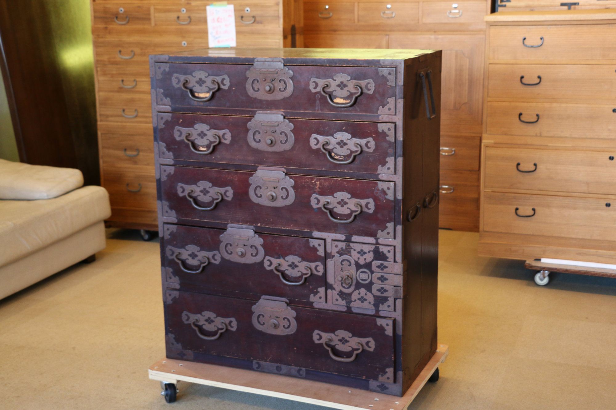 つづいては、濃い焦げ茶の塗装が印象的な桐箪笥です。