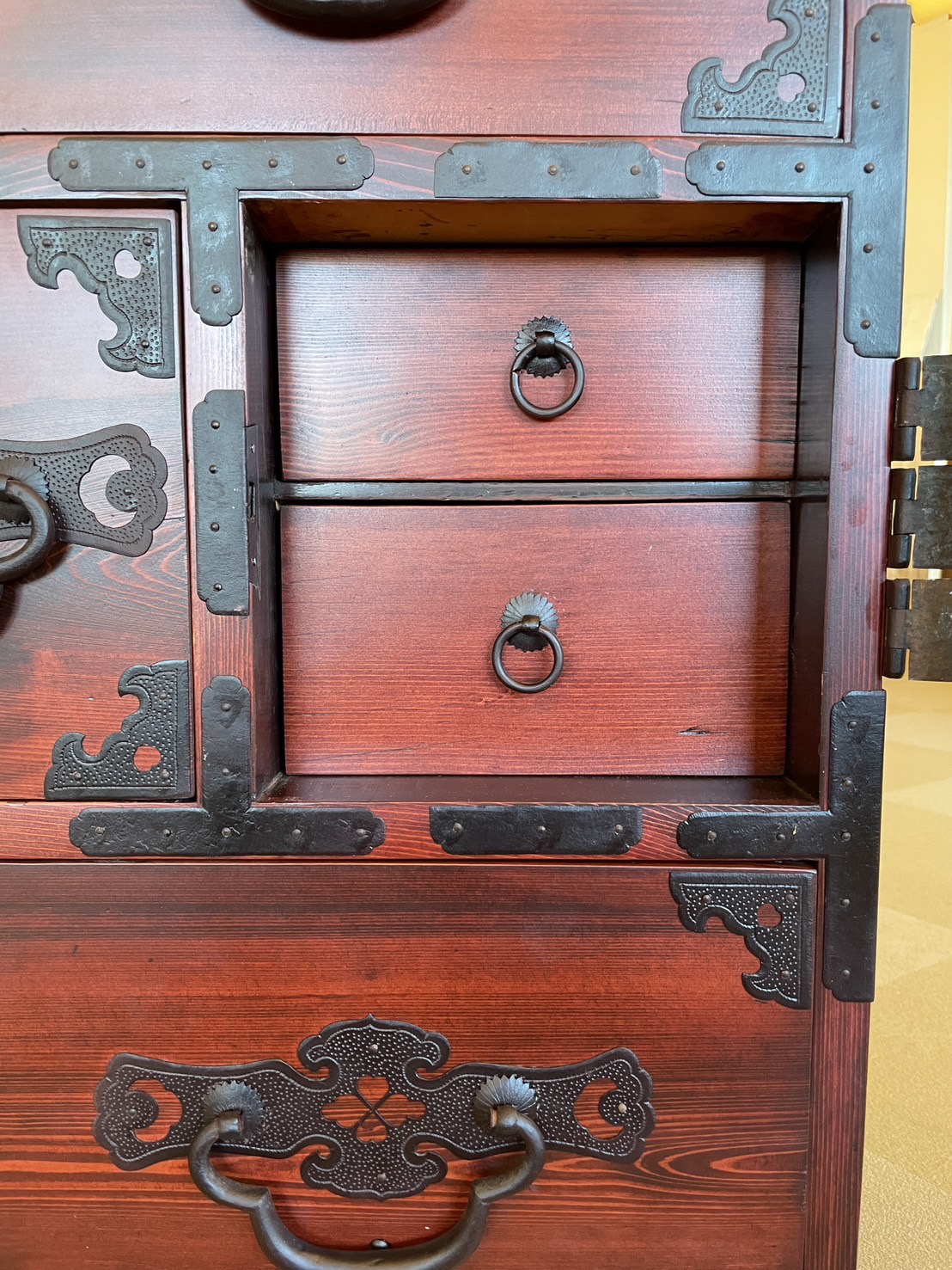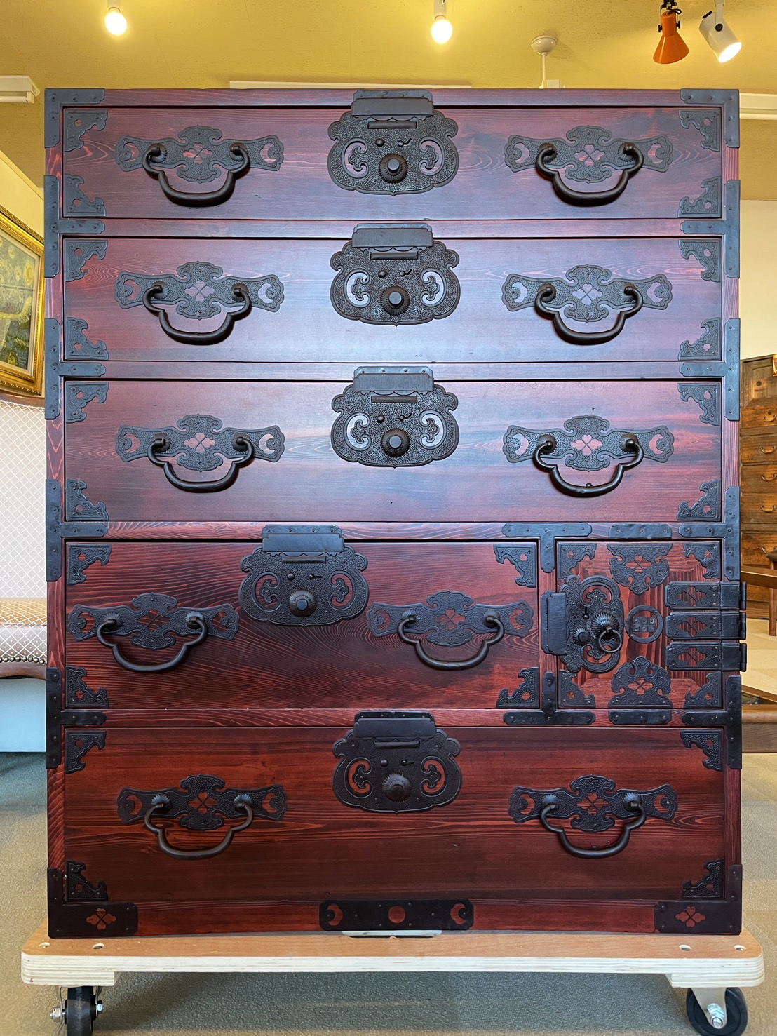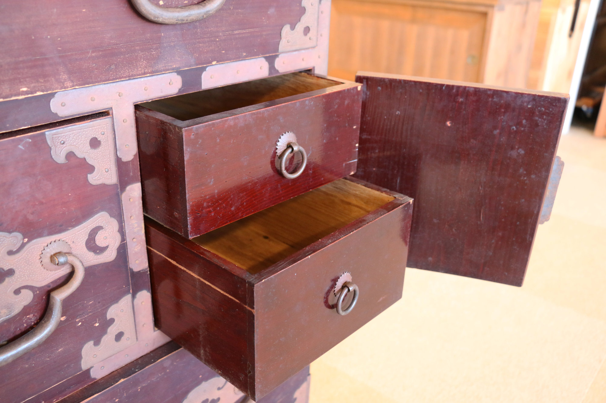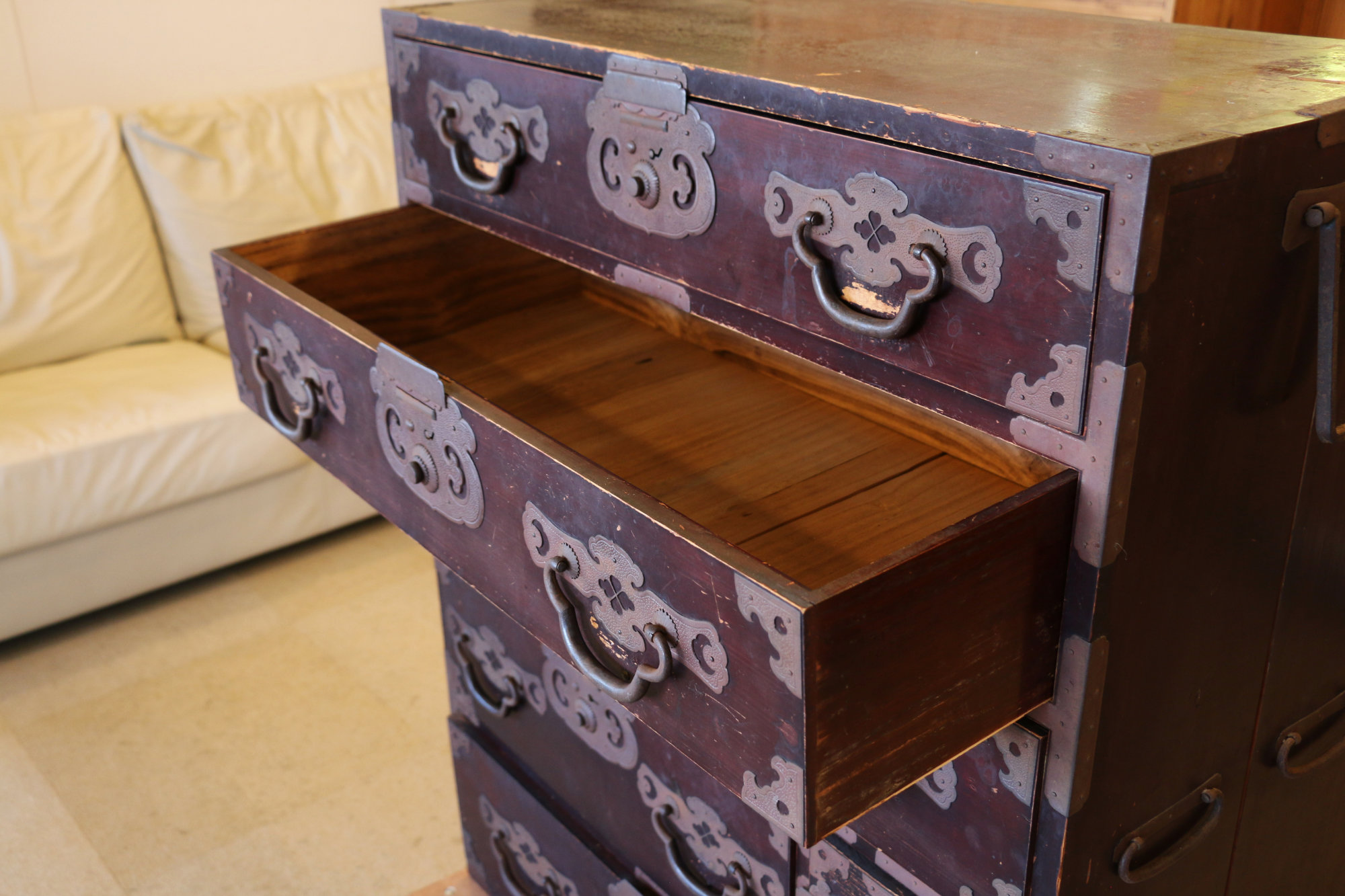 つづいては、濃い焦げ茶の塗装が印象的な桐箪笥です。
