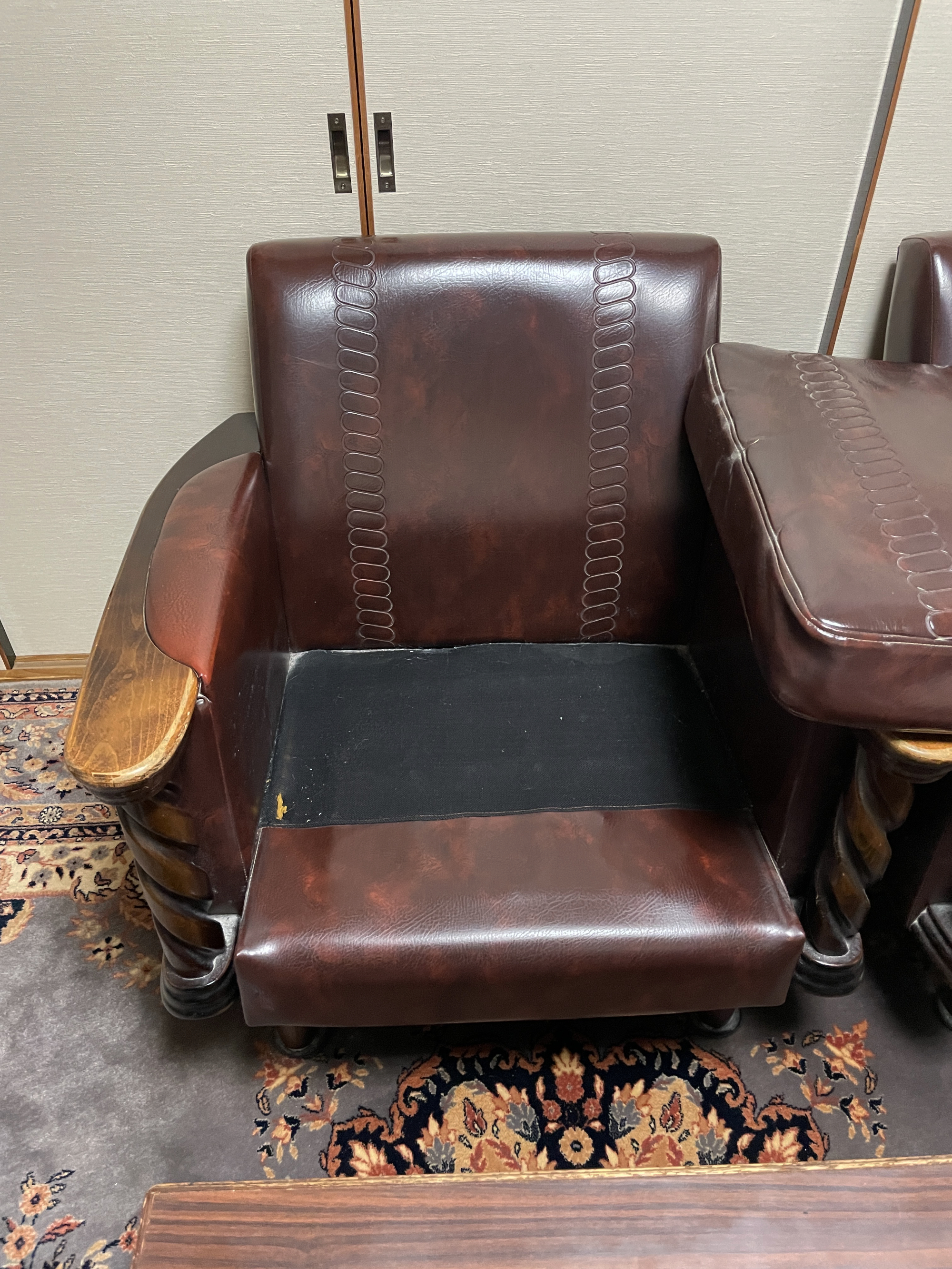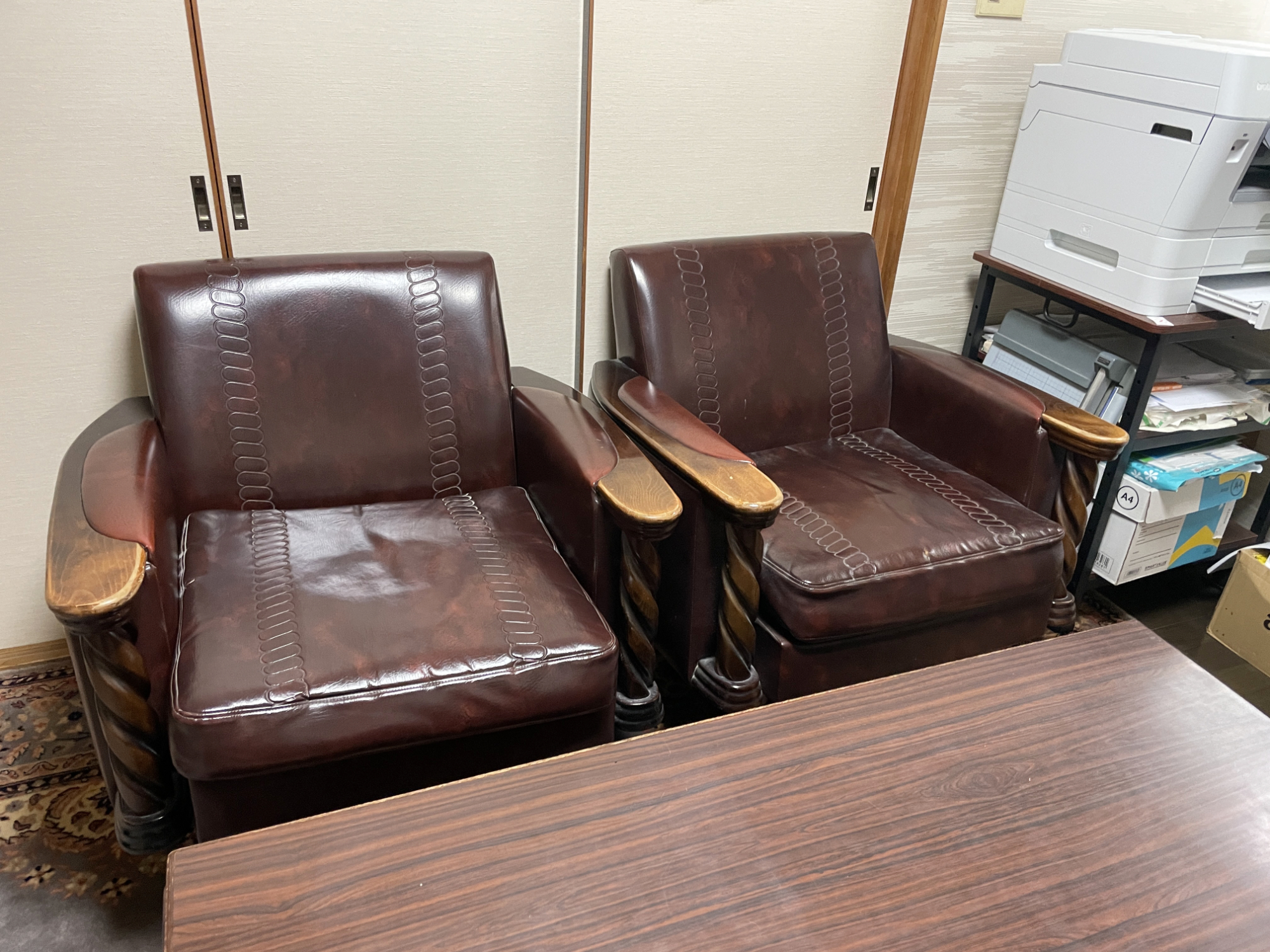 寺務所という場所柄、多くの方が腰を下ろしてきた応接セット。その分、ソファは全体的にくたびれた印象があり、座面や背もたれの張地には長年の使用によるへたりが見られました。